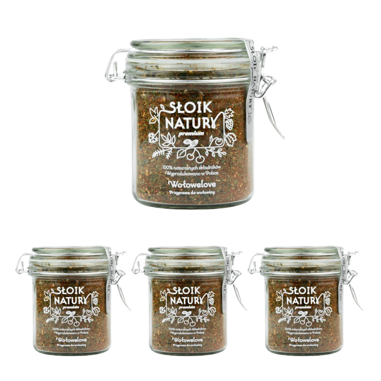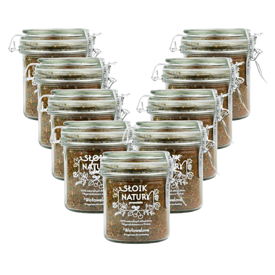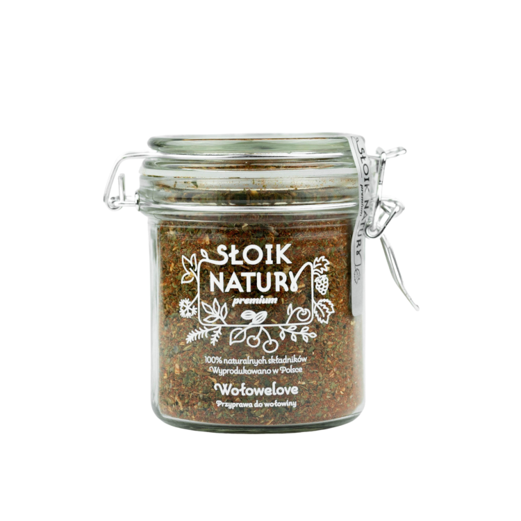 „Wołowelove” pakujemy w szczelne szklane słoiki z klamrą, które doskonale chronią przyprawę przed wilgocią i utratą aromatu. Dzięki temu mieszanka długo zachowuje świeżość i pełnię smaku.